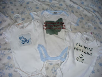 Here are some onesies that I got as gifts. They were originally plain white, so I spruced them up. The first one is with a patch my friend gave me. The rest are all decorated with iron-on transfers.
