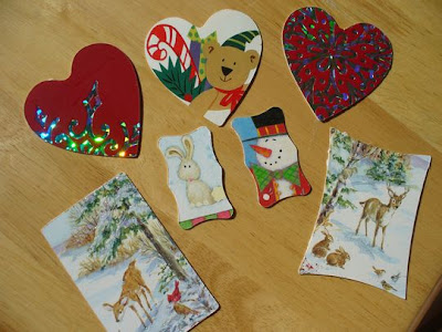 Speaking of greeting cards, does anyone else recycle them to extend their life? I have a large basket full of cards that sits upon my Hoosier Cabinet. I am getting into scrapbooking, so I have been dismantling my old cards to use in a scrapbook for my son. I also cut up Christmas cards and make tags for Christmas gifts with them. I have a stamp somewhere that says "to" and "from" which I will place on the back of these little recycled goodies. I'll leave you with some pics.